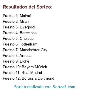 Lista de participantes: Borussia Dortmund, Tottenham, Elche, Bayern Múnich, Liverpool, Milan, Real Madrid, Barcelona, Chelsea, Manchester City, Malmö, Arsenal.
