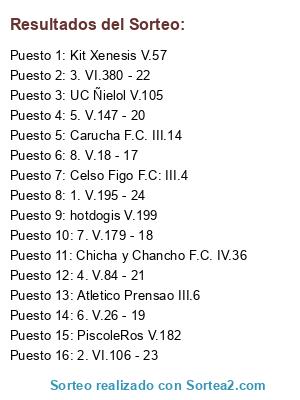 Lista de participantes: 1. V.195 - 24, 2. VI.106 - 23, 3. VI.380 - 22, 4. V.84 - 21, 5. V.147 - 20, 6. V.26 - 19, 7. V.179 - 18, 8. V.18 - 17, Atletico Prensao III.6, Chicha y Chancho F.C. IV.36, Kit Xenesis V.57, Carucha F.C. III.14, PiscoleRos V.182, hotdogis V.199, UC Ñielol V.105, Celso Figo F.C: III.4.