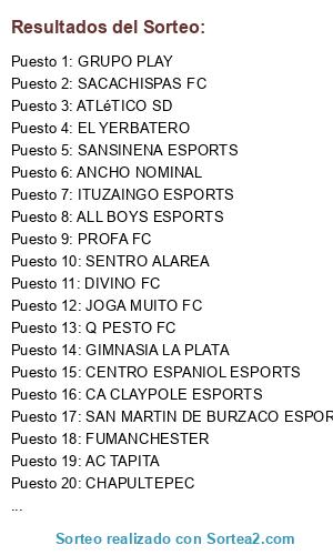 Lista de participantes: SACACHISPAS FC, JOGA MUITO FC, ITUZAINGO ESPORTS, CHAPULTEPEC, SAN MARTIN DE BURZACO ESPORTS, VIEJO Y PELUDO, ODIN GAMING, DIVINO FC, GRUPO PLAY, PROFA FC, ALL BOYS ESPORTS, CA CLAYPOLE ESPORTS, FUMANCHESTER, GIMNASIA LA PLATA, AC TAPITA, ATLéTICO SD, EL YERBATERO, X MEN FC, FLORES CITY, Q PESTO FC, SENTRO ALAREA, CENTRO ESPANIOL ESPORTS, ANCHO NOMINAL, SANSINENA ESPORTS.