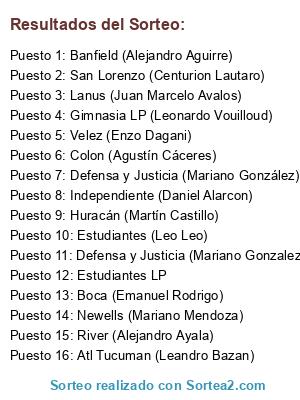 Lista de participantes: Defensa y Justicia (Mariano Gonzalez, Estudiantes LP, Atl Tucuman (Leandro Bazan), Independiente (Daniel Alarcon), San Lorenzo (Centurion Lautaro), Gimnasia LP (Leonardo Vouilloud), Newells (Mariano Mendoza), Velez (Enzo Dagani), Huracán (Martín Castillo), Colon (Agustín Cáceres), Boca (Emanuel Rodrigo), River (Alejandro Ayala), Banfield (Alejandro Aguirre), Lanus (Juan Marcelo Avalos), Defensa y Justicia (Mariano González), Estudiantes (Leo Leo).
