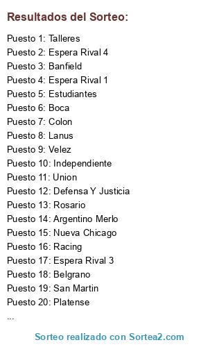 Lista de participantes: Nueva Chicago, Independiente, San Martin, Boca, Talleres, Newells, Banfield, River, Argentinos, Rosario, Velez, Belgrano, Estudiantes, Platense, Lanus, All Boys, Colon, Barracas, Sarmiento, Argentino Merlo, San Lorenzo, Racing, Union, Deportivo Madryn, Defensa Y Justicia, Tigre, Gimnasia LP, Espera Rival 1, Espera Rival 2, Espera Rival 3, Espera Rival 4, Espera Rival 5.