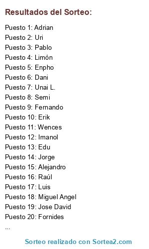 Lista de participantes: Fernando, Unai M., Alejandro, Erik, Wences, Adrian, Jorge, Imanol, Enpho, Limón, Ander, Unai L., Jose David, Raúl, Pablo, Uri, Edu, Luis, Miguel Angel, Fornides, Semi, Dani.