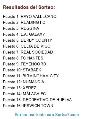 Lista de participantes: CELTA DE VIGO, BIRMINGHAM CITY, STABAEK, REAL SOCIEDAD, RAYO VALLECANO, DERBY COUNTY, READING FC, NUMANCIA, XEREZ, FC NANTES, MÁLAGA FC, REGGINA, FEYENOORD, L.A. GALAXY, RECREATIVO DE HUELVA, IPSWICH TOWN.