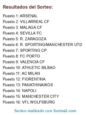 Lista de participantes: ARSENAL, VALENCIA CF, AC MILAN, ATHLETIC BILBAO, NAPOLI, VILLARREAL CF, MALAGA CF, R. SPORTING/MANCHESTER UTD, R. ZARAGOZA, SEVILLA FC, FC PORTO, MANCHESTER CITY, VFL WOLFSBURG, FIORENTINA, PANATHINAIKOS, SPORTING CP.