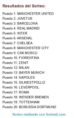 Lista de participantes: BARCELONA, REAL MADRID, MANCHESTER CITY, MILAN, CHELSEA, MANCHESTER UNITED, CSK MOSCU, BAYER MUNICH, ARSENAL, INTER, JUVETUS, FIORENTINA, LEVERPOOL, ROMA, TOTTENHAM, ZENIT, NAPOLES, WENDER BREMEN, BORUSSIA DORTMUND, SILKIESTPOLLIZ.