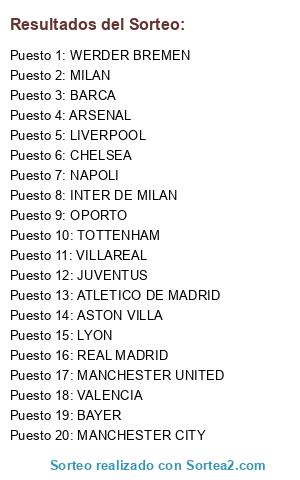 Lista de participantes: LIVERPOOL, VILLAREAL, REAL MADRID, BAYER, MILAN, CHELSEA, BARCA, ARSENAL, OPORTO, TOTTENHAM, NAPOLI, LYON, VALENCIA, JUVENTUS, ATLETICO DE MADRID, MANCHESTER UNITED, ASTON VILLA, MANCHESTER CITY, INTER DE MILAN, WERDER BREMEN.