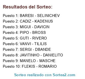 Lista de participantes: FLEKIS - ROMARIO, PIPO - BROSS, GUTI - RIVERO, MANELO - MASCHE, JAVITINHO - DANIELITO, MIGUI - DAVICIN, VANVI - TILILIS, BARESI - SELINICHEV, SERGI - DBANDE, CADIZ - KADENUS.