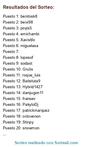 Lista de participantes: poyis5, luis_22 , Batistuta9 , Hybrid1427 , miguelasa , Jaf_xtugos , patrickmarquez , Stoned , snowmon, octovenon , lopesof , marcoslj23, roque_luis , maritxurri, fransev , danijugon11 , Dr_Mathius , sodast , Xavistilo, benitosk8, Shakily, jpc_89, Danito79, PakytoDj, pantic14, Grulis, emichambi, Stinpy, llaser, beivi98, ruchi17, mazinger2008, .