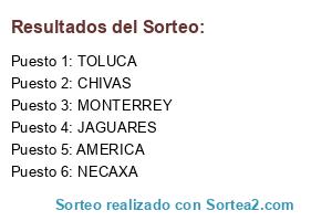 Lista de participantes: AMERICA, MONTERREY, TOLUCA, JAGUARES, NECAXA, CHIVAS.