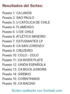 Lista de participantes: BOCA JUNIORS, RIVER PLATE, SAN LORENZO, ESTUDIANTES LP, RACING, LANÚS, ATL MINEIRO, GREMIO, SAO PAULO, FLAMENGO, CORINTHIANS, CRUZEIRO, U CATÓLICA CHILE, U DE CHILE, COLO COLO, UNIÓN ESPAÑOLA.