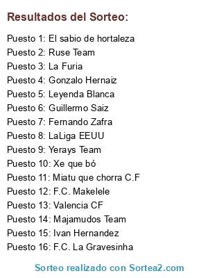 Lista de participantes: LaLiga EEUU, Valencia CF, Ruse Team, El sabio de hortaleza, Guillermo Saiz, Fernando Zafra, F.C. La Gravesinha, F.C. Makelele, Ivan Hernandez, La Furia, Miatu que chorra C.F, Xe que bó, Majamudos Team, Leyenda Blanca, Yerays Team, Gonzalo Hernaiz.