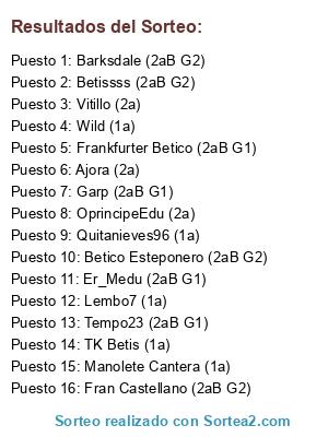 Lista de participantes: TK Betis (1a), Ajora (2a), Manolete Cantera (1a), Garp (2aB G1), Barksdale (2aB G2), Wild (1a), Betissss (2aB G2), Lembo7 (1a), Betico Esteponero (2aB G2), Quitanieves96 (1a), OprincipeEdu (2a), Frankfurter Betico (2aB G1), Fran Castellano (2aB G2), Tempo23 (2aB G1), Vitillo (2a), Er_Medu (2aB G1).