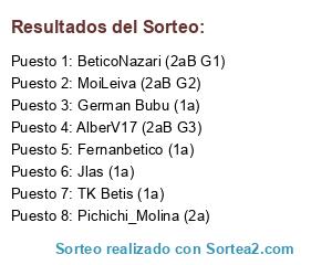 Lista de participantes: Pichichi_Molina (2a), TK Betis (1a), BeticoNazari (2aB G1), Fernanbetico (1a), Jlas (1a), MoiLeiva (2aB G2), German Bubu (1a), AlberV17 (2aB G3).