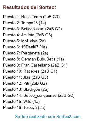 Lista de participantes: BeticoNazari (2aB G2), MoiLeiva (2a), Jlas (2aB G3), 19Dani07 (1a), Nane Team (2aB G3), Blackgon (2a), Wild (1a), Fran Castellano (2aB G1), Tempo23 (1a), Racebes (2aB G1), Piti (2aB G2), Pergañeta (2a), Betico_conquense (2aB G2), JmJota (2aB G3), Teskiyá (2a), German BubuBetis (1a).