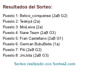Lista de participantes: Nane Team (2aB G3), JmJota (2aB G3), MoiLeiva (2a), German BubuBetis (1a), Fran Castellano (2aB G1), Piti (2aB G2), Betico_conquense (2aB G2), Teskiyá (2a).