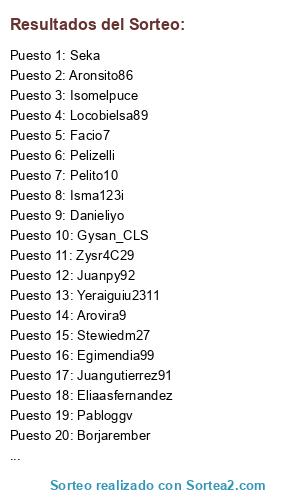 Lista de participantes: Juangutierrez91, Isma123i, Zysr4C29, Pelito10, Facio7, Seka, Arovira9, Assasinstoto, BorjaRT13, Yeraiguiu2311, Pelizelli, Eliaasfernandez, Locobielsa89, Aitorsarria32, Sacisto, Spain_Kiko, Peppuz07, Furru_asesino21, Pabloggv, Aronsito86, Stewiedm27, IvaanM95, J_murcia, Farinheros50, R9ronie, Gysan_CLS, Juanpy92, Ramalho55, Borjarember, Pedrovelasco95, Manzy, Egimendia99, Sersol13, Danieliyo, Ojky33, B190514L170693, Isomelpuce, BoBeSpOnJaLlegoo, Fer_man-87, Byronmixeleroney.