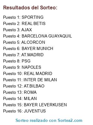 Lista de participantes: INTER DE MILAN, SPORTING, AT.BILBAO, AT.MADRID, MILAN, ROMA, BAYER LEVERKUSEN, NAPOLES, ALCORCON, REAL BETIS, PSG, BAYER MUNICH, JUVENTUS, REAL MADRID, BARCELONA GUAYAQUIL, AJAX.