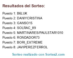 Lista de participantes: JAVIPEREZFERROL, RONDADOR73, DANIYCRISTINA, MARTINARES/PAULSTAR1010, GANSO15, SOLRAC_89, B6LUK, BORI_EXTREME.