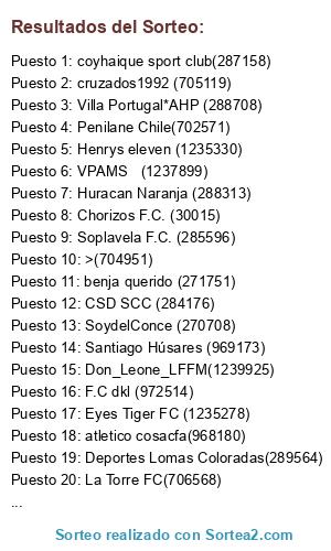 Lista de participantes: coyhaique sport club(287158), Don_Leone_LFFM(1239925), Curicó Unido FC(971959), Penilane Chile(702571), Deportes Lomas Coloradas(289564), La Torre FC(706568), >(704951), atletico cosacfa(968180), d2net.cl Chile(701365), PICHOYO F.C (970929), Boca Sur F.C (969529), VPAMS (1237899), Huracan Naranja (288313), Henrys eleven (1235330), C.S y D. Mafia S.A. (0703338), atlety (701805), F.C dkl (972514), cruzados1992 (705119) , Eyes Tiger FC (1235278) , Chorizos F.C. (30015), f.c leones rojos (289200) , C.D. Universidad Católica (1236392) , AC Deportesticulo (707153) , Deportivo Nirvana (971319) , Real Naty (703169) , Soplavela F.C. (285596) , benja querido (271751) , SoydelConce (270708) , CSD SCC (284176) , Santiago Húsares (969173) , Villa Portugal*AHP (288708) , Zobtik United FC (706256).