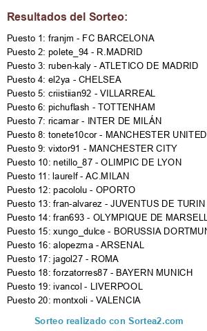 Lista de participantes: polete_94 - R.MADRID, franjm - FC BARCELONA, ricamar - INTER DE MILÁN, el2ya - CHELSEA, tonete10cor - MANCHESTER UNITED, vixtor91 - MANCHESTER CITY, laurelf - AC.MILAN, forzatorres87 - BAYERN MUNICH, alopezma - ARSENAL, jagol27 - ROMA, ivancol - LIVERPOOL, pacololu - OPORTO, ruben-kaly - ATLETICO DE MADRID, pichuflash - TOTTENHAM, xungo_dulce - BORUSSIA DORTMUND, netillo_87 - OLIMPIC DE LYON, fran693 - OLYMPIQUE DE MARSELLA, fran-alvarez - JUVENTUS DE TURIN, criistiian92 - VILLARREAL, montxoli - VALENCIA.