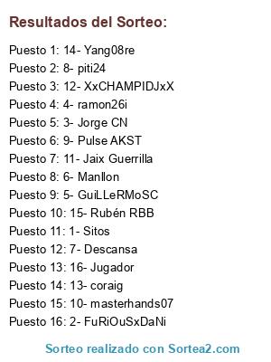 Lista de participantes: 1- Sitos, 2- FuRiOuSxDaNi, 3- Jorge CN, 4- ramon26i, 5- GuiLLeRMoSC, 6- Manllon, 7- Descansa, 8- piti24, 9- Pulse AKST, 10- masterhands07, 11- Jaix Guerrilla, 12- XxCHAMPIDJxX, 13- coraig, 14- Yang08re, 15- Rubén RBB, 16- Jugador.