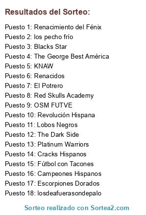 Lista de participantes: Revolución Hispana, Platinum Warriors, El Potrero, Red Skulls Academy, OSM FUTVE, The Dark Side, Escorpiones Dorados, KNAW, Fútbol con Tacones, Lobos Negros, losdeafuerasondepalo, Campeones Hispanos, Renacimiento del Fénix, los pecho frío, The George Best América, Renacidos, Blacks Star, Cracks Hispanos.