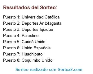 Lista de participantes: Universidad Católica, Deportes Antofagasta, Deportes Iquique, Curicó Unido, Unión Española, Huachipato, Coquimbo Unido, Palestino.
