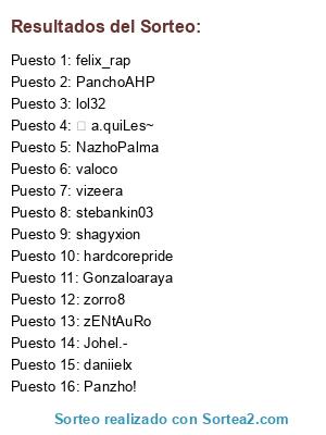 Lista de participantes: Johel.-, lol32, valoco, zENtAuRo, zorro8, NazhoPalma, Panzho!, Gonzaloaraya, shagyxion, stebankin03, felix_rap, PanchoAHP, vizeera, ★ a.quiLes~, hardcorepride, daniielx.