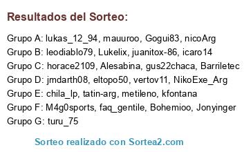 Lista de participantes: kfontana, juanitox-86, leodiablo79, NikoExe_Arg, nicoArg, horace2109, mauuroo, jmdarth08, faq_gentile, Bohemioo, M4g0sports, lukas_12_94, gus22chaca, chila_lp, metileno, eltopo50, turu_75, Barriletec, icaro14, Jonyinger, Gogui83, vertov11, tatin-arg, Alesabina, Lukelix.