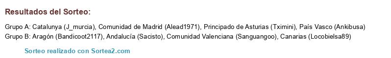 Lista de participantes: Comunidad de Madrid (Alead1971), Catalunya (J_murcia), Andalucía (Sacisto), Comunidad Valenciana (Sanguangoo), País Vasco (Ankibusa), Canarias (Locobielsa89), Principado de Asturias (Tximini), Aragón (Bandicoot2117).