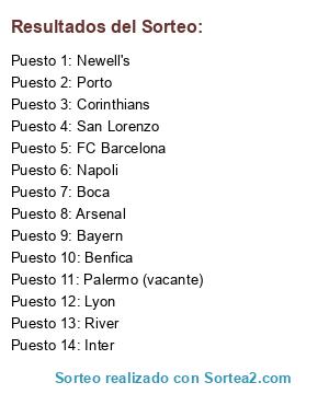 Lista de participantes: FC Barcelona, San Lorenzo, Napoli, Arsenal, Boca, Palermo (vacante), Corinthians, Bayern, Porto, River, Lyon, Newell's, Benfica, Inter.