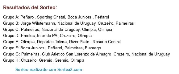 Lista de participantes: River Plate (1), Boca Juniors (2), Gremio(3), Nacional de Uruguay(4), Peñarol(5), Palmeiras(6), Cruzeiro(7), Olimpia(8), Atletico Paranaense, Cerro Porteño, Club Atletico San Lorenzo de Almagro, Emelec, Inter de PA, Flamego, U. Catolica, Sporting Cristal, Rosario Central, Jorge Wilstermann, Liga de Quito, Alianza de Lima, Huracán, Godoy Cruz, Zamora, Junior de Barranquilla, Deportivo Lara, Deportes Tolima, Universidad de Concepción, Bolivia 2 (San Jose/Royal Pari), Rep 1, Rep 2, Rep 3, Rep 4.