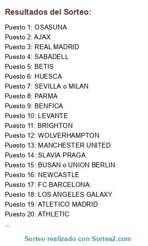 Lista de participantes: BUSAN o UNION BERLIN, SLAVIA PRAGA, ATHLETIC, SEVILLA o MILAN, MANCHESTER UNITED, VALENCIA, ST PAULI, PARMA, LEVANTE, HUESCA, LAS PALMAS, AJAX, FC BARCELONA, FUENLABRADA, OSASUNA, BETIS, SABADELL, NEWCASTLE, MALAGA, REAL MADRID, LEEDS, BRIGHTON, PSG, ATLETICO MADRID, CELTIC, ESPANYOL, LOS ANGELES GALAXY, REAL ZARAGOZA, WOLVERHAMPTON, BENFICA, GIRONA, PSV o LIVERPOOL.