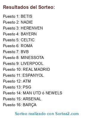 Lista de participantes: BETIS, CELTIC, ARSENAL, PSG, BAYERN, HERENVEN, BVB, NADIE, REAL MADRID, ATM, LIVERPOOL, ROMA, BARÇA, MAN UTD ó NEWELS, ESPANYOL, MINESSOTA.