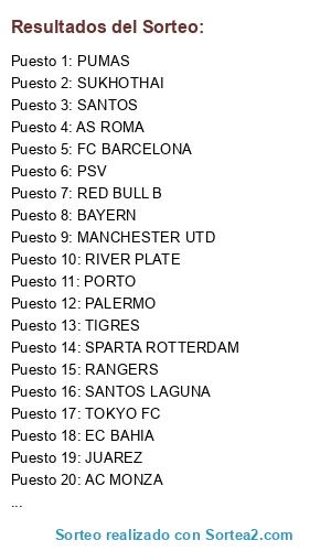 Lista de participantes: AC MONZA, AS ROMA, BAYERN, BENFICA, BESIKTAS, C. TIJUANA, EC BAHIA, FC BARCELONA, INTER, JUAREZ, LAZIO, LILLE, MANCHESTER UTD, MELBOURNE, MIAMI, MONTEREY BAY, NAPOLI, OL. MARSELLA, ORANGE C, PALERMO, PORTO, PSV, PUMAS, RANGERS, RED BULL B, RIVER PLATE, SANTOS, SANTOS LAGUNA, SPARTA ROTTERDAM, SUKHOTHAI, TIGRES, TOKYO FC.