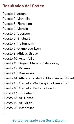 Lista de participantes: Morelia , Manchester City , Arsenal , Barcelona , Liverpool , Chelsea , Atletico de Madrid Manchester United Valencia , Real Madrid, Inter Milan , AC Milan , Tottenham , Olympique Lyon , AS Roma , Athletic Bilbao, Elche , Aston Villa, Sevilla , Juventus , Bayern Munich Galatasaray , Hoffenheim, Marsella, Burdeos, Werder Bremen, Fiorentina, Villareal, Sttutgart, Benfica, Ganador Porto vs Everton, Ganador Wolfburgo vs Hamburgo.