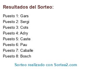 Lista de participantes: Bosch, Cots, Caste, Gars, Adry, Pau, Caballe, Sergi.