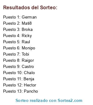 Lista de participantes: Broka, Mati8, Castro, Monipo, Raigor, Pancho, German, Raul, Chalo, Hector, Ricky, Tobi, Benja.