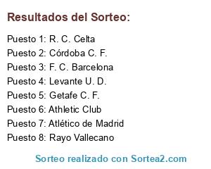Lista de participantes: Levante U. D., Getafe C. F., Athletic Club, Rayo Vallecano, Córdoba C. F., R. C. Celta, F. C. Barcelona, Atlético de Madrid.