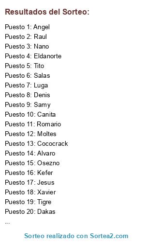 Lista de participantes: Nazkar, Mingoron, Tigre, Raul, Eldanorte, Miguel, Fran Ruiz, Enrique, Moltes, Alvaro, Xavier, Alexking, Romario, Jag, M.Verde, Popeye, Cirujano, Raks, Denis, Jesus, Charlie, Salas, Crespo, Santos, Dakas, Luga, Samy, Isrita, Nano, Panacca, Fabio, Tito, Angel, Edu, Canita, Tiparraco, Cococrack, Osezno, Carlos, Kefer.