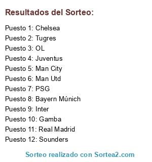 Lista de participantes: Chelsea, Man Utd, Man City, Real Madrid, PSG, Bayern Múnich, OL, Juventus, Inter, Gamba, Sounders, Tugres.
