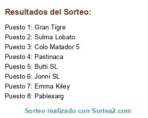 Lista de participantes: Sulma Lobato, Emma Kiley, Pablexarg, Gran Tigre, Pastinaca, Colo Matador 5, Butti SL, Jonni SL.