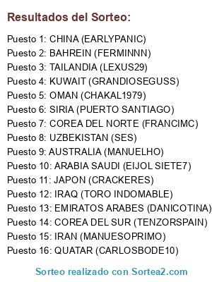 Lista de participantes: AUSTRALIA (MANUELHO), BAHREIN (FERMINNN), CHINA (EARLYPANIC), IRAN (MANUESOPRIMO), IRAQ (TORO INDOMABLE), JAPON (CRACKERES), KUWAIT (GRANDIOSEGUSS), COREA DEL NORTE (FRANCIMC), OMAN (CHAKAL1979), QUATAR (CARLOSBODE10), ARABIA SAUDI (EIJOL SIETE7), COREA DEL SUR (TENZORSPAIN), SIRIA (PUERTO SANTIAGO), TAILANDIA (LEXUS29), EMIRATOS ARABES (DANICOTINA), UZBEKISTAN (SES).