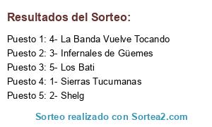Lista de participantes: 1- Sierras Tucumanas, 2- Shelg, 3- Infernales de Güemes, 4- La Banda Vuelve Tocando, 5- Los Bati.