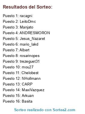 Lista de participantes: Albert, Chelobest, LeitoDmc, mario_lakd, mou27, Arkuan, Jesus_Nazaret, rosarinopes, CARP, Manjato, NHollmann, MaxiVazquez, racagni, ANDRESMORON, Basita, trezeguet31.