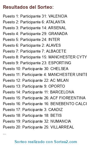 Lista de participantes: Participante 1: OVIEDO, Participante 2: ALAVES, Participante 3: CAADIZ, Participante 4: MANCHESTER UNITED, Participante 5: TENERIFE, Participante 6: ATALANTA, Participante 7: ALBACETE, Participante 8: ROMA, Participante 9: OPORTO, Participante 10: PSG, Participante 11: BARCELONA, Participante 12: VALLADOLID, Participante 13: REALÑ SOCIEDAD, Participante 14: ARSENAL, Participante 15: MANCHESTER CYTY, Participante 16: BENEBENTO CALCIO, Participante 17: MALAGA, Participante 18: BETIS, Participante 19: JUVENTUS, Participante 20: RCD ESPAÑOL, Participante 21: ATLETICO DE MADRID, Participante 22: AC MILAN, Participante 23: ESPORTING, Participante 24: INTER, Participante 25: VILLARREAL, Participante 26: ACF FIOREENTINA, Participante 27: BORUSSIA DORTMUND, Participante 28: GIRONA FC, Participante 29: GRANADA, Participante 30: CHELSEA, Participante 31: VALENCIA, Participante 32: NUMANCIA.