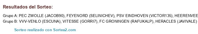 Lista de participantes: FEYENORD (SELINICHEV), VITESSE (GORRI7), FC GRONINGEN (RAFUKALP), PEC ZWOLLE (JACOB90), HEERENVEEN (VOODOO_BCN), VVV-VENLO (ESCUNA), HERACLES (JAVIVALE), PSV EINDHOVEN (VICTOR135).
