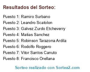 Lista de participantes: Leandro Scatolon, Rodolfo Roggero, Ramiro Surbano, Matias Sanchez, Vitor Santos Canuto, Robinson Tarazona Ardila, Francisco Orellana, Galvez Zurdo Etcheverry.