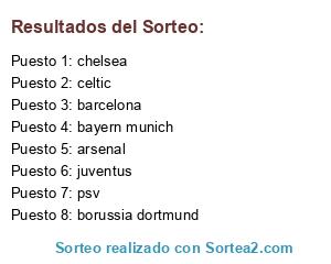 Lista de participantes: juventus, arsenal, barcelona, psv, chelsea, borussia dortmund, bayern munich, celtic.