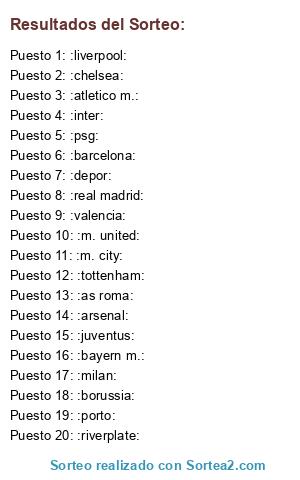 Lista de participantes: :barcelona:, :bayern m.:, :juventus:, :m. city:, :psg:, :real madrid:, :as roma:, :tottenham:, :arsenal:, :borussia:, :chelsea:, :atletico m.:, :inter:, :liverpool:, :m. united:, :milan:, :porto:, :riverplate:, :valencia:, :depor:.